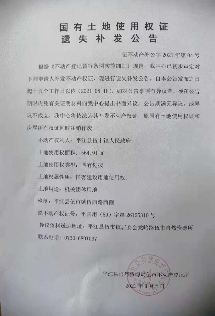 平江县伍市镇人民政府国有土地使用权证遗失补发公告