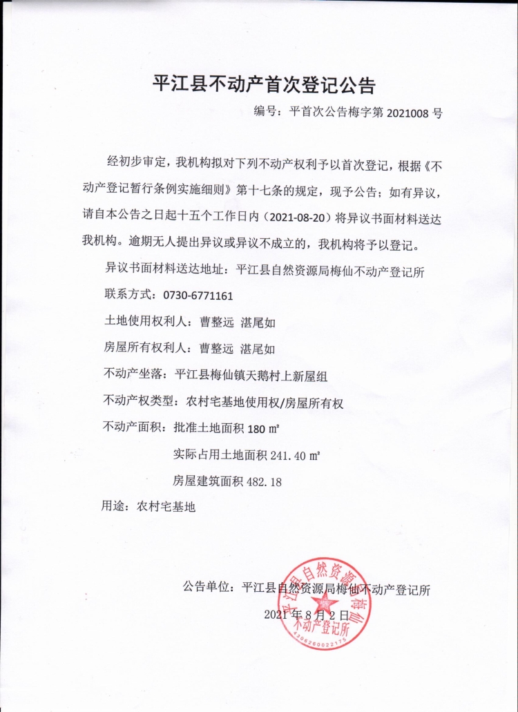 曹整远 湛尾如平江县不动产首次登记公告