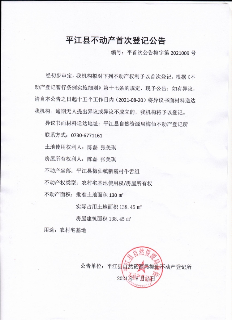 陈磊 张美琪 平江县不动产首次登记公告
