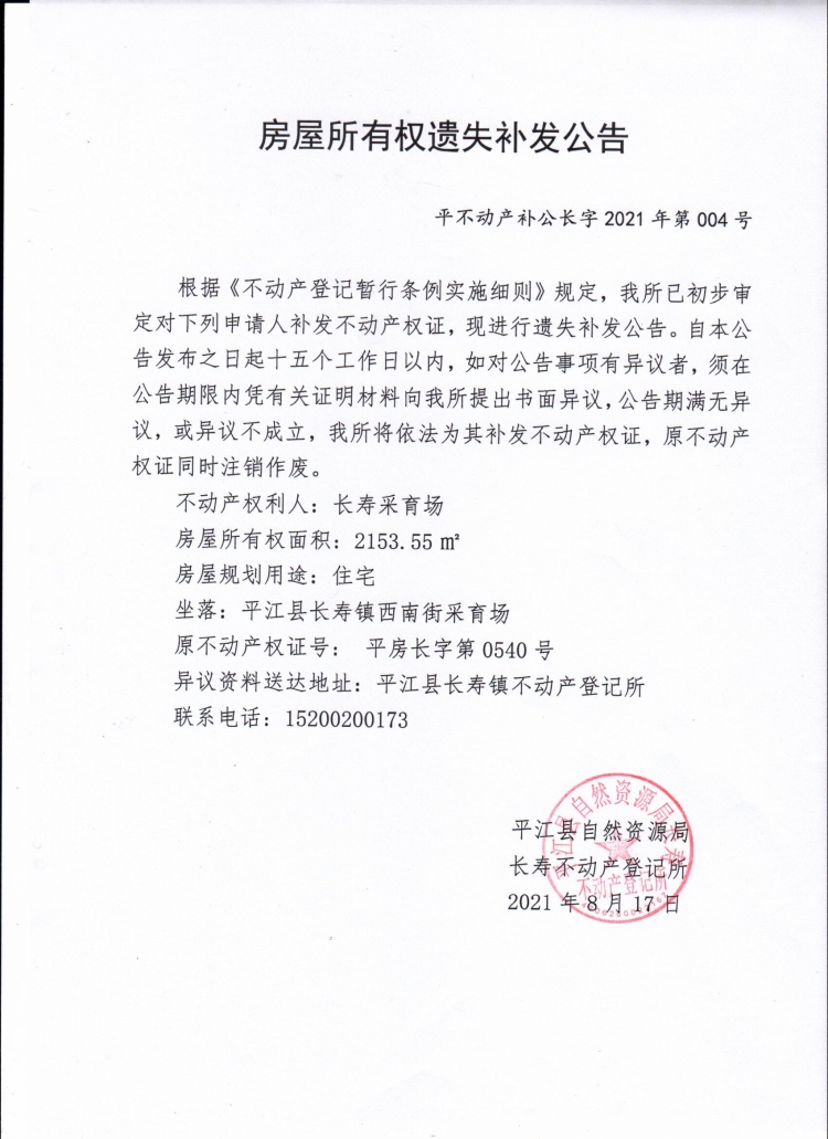 长寿采育场不动产登记遗失补发公告