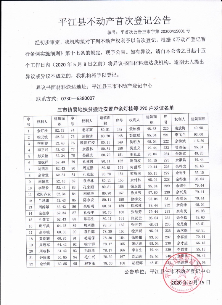 三市镇余灯桂等290户易地搬迁不动产首次登记公告