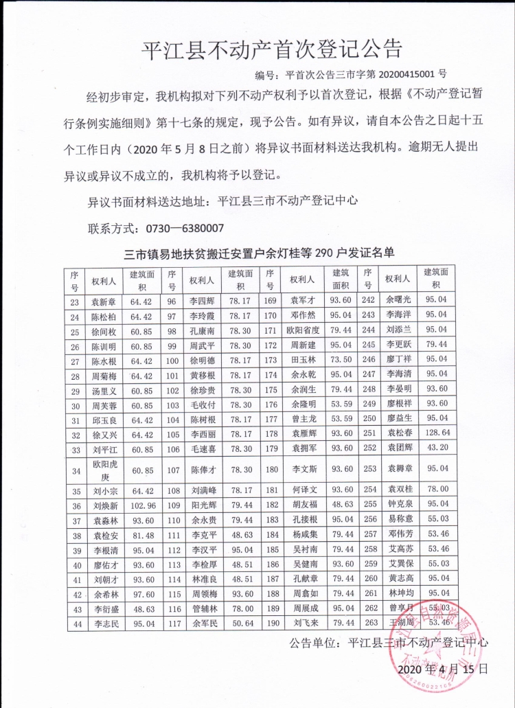 三市镇余灯桂等290户易地搬迁不动产首次登记公告