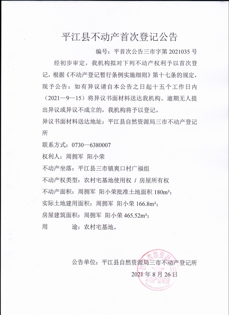 周拥军 阳小荣不动产首次登记公告