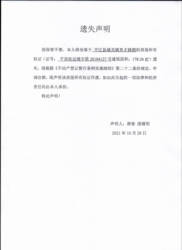 唐春 湛媛明房屋所有权证遗失声明