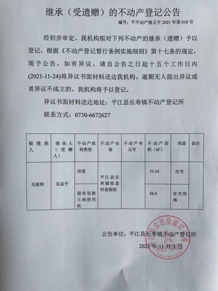 吴益平继承(受遗赠)的不动产登记公告
