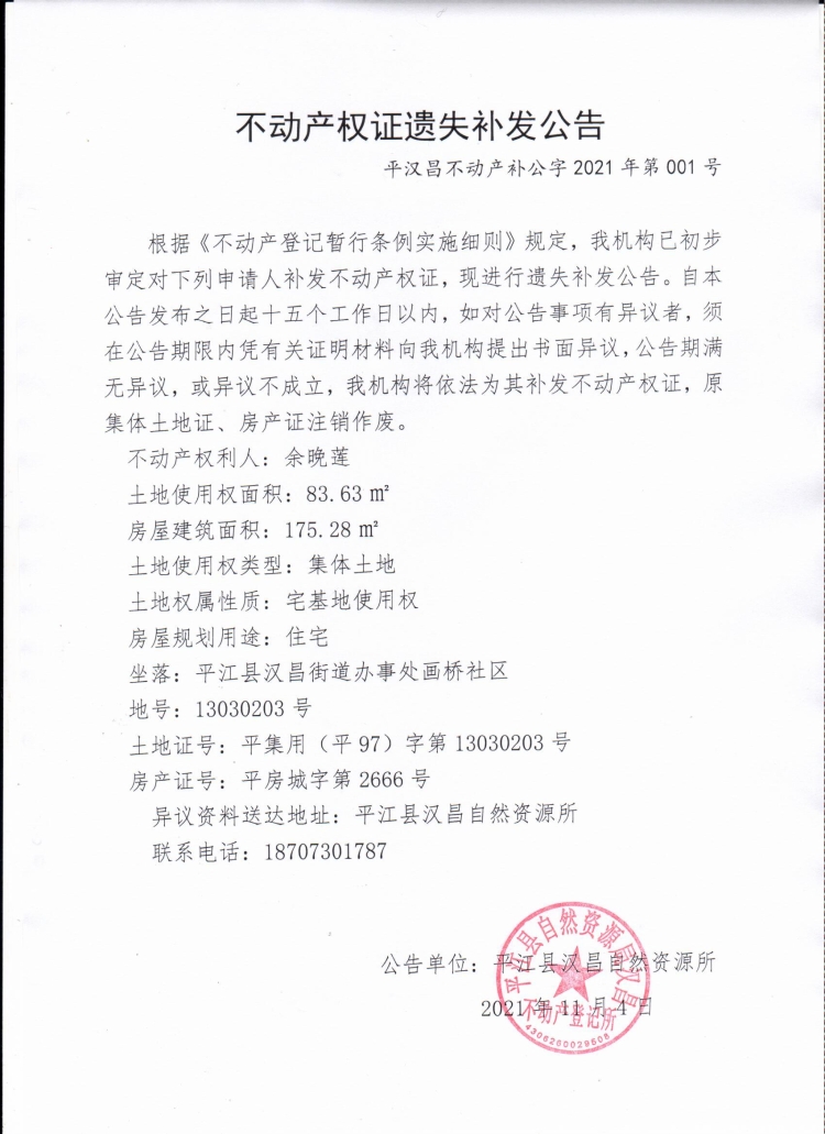 余晚英不动产权证遗失补发公告