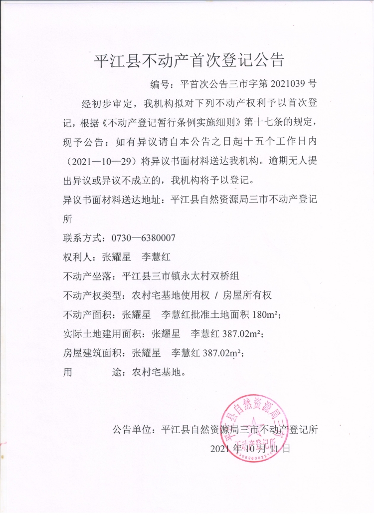 张耀星 李慧红不动产首次登记公告