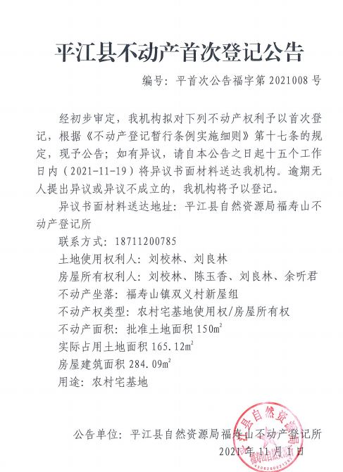 刘校林、陈玉香、刘良林、余听君位于福寿山农村宅基地及房屋所有权的首次登记公告