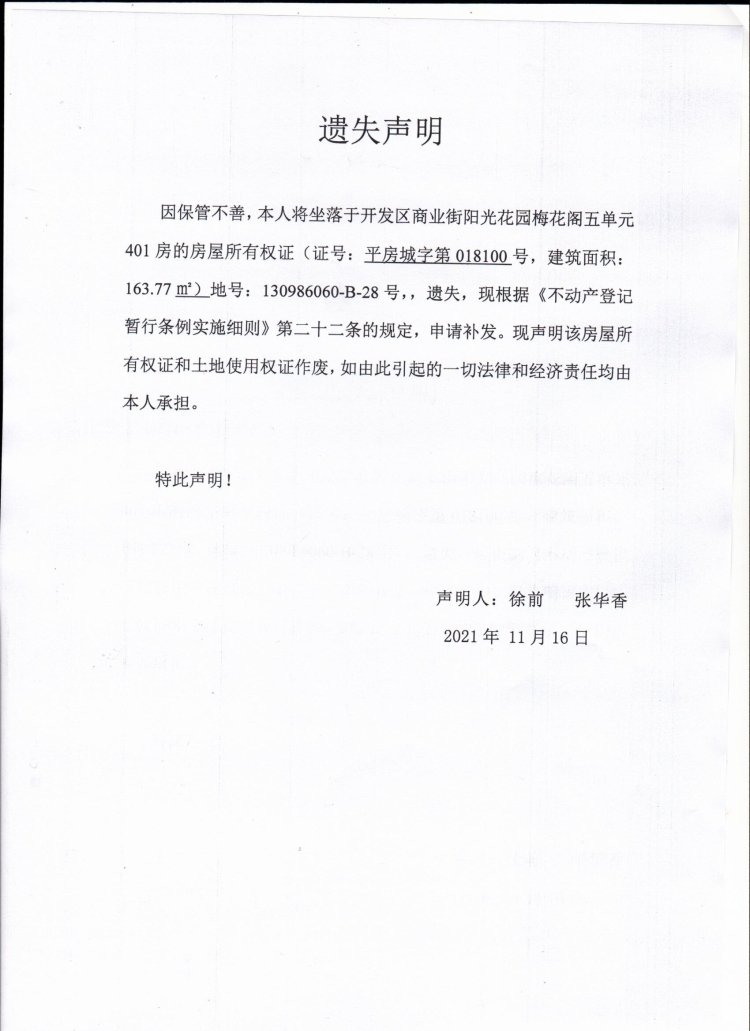 徐前、张华香房屋所有权证和国土证遗失声明.jpg