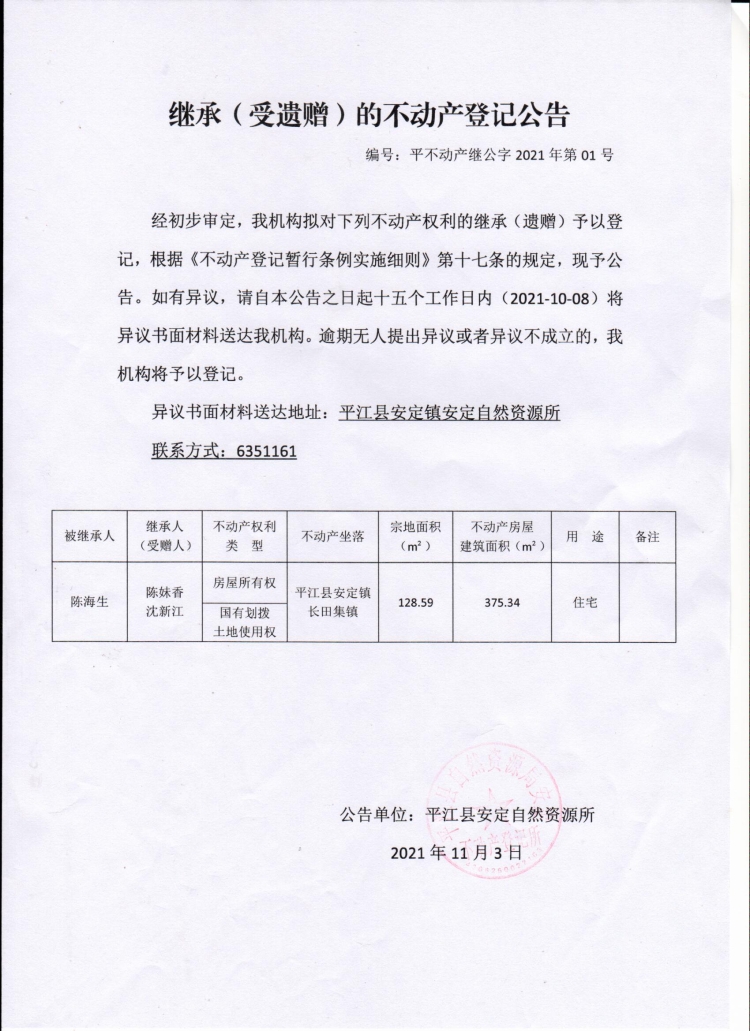 陈妹香继承(受遗赠)的不动产登记公告