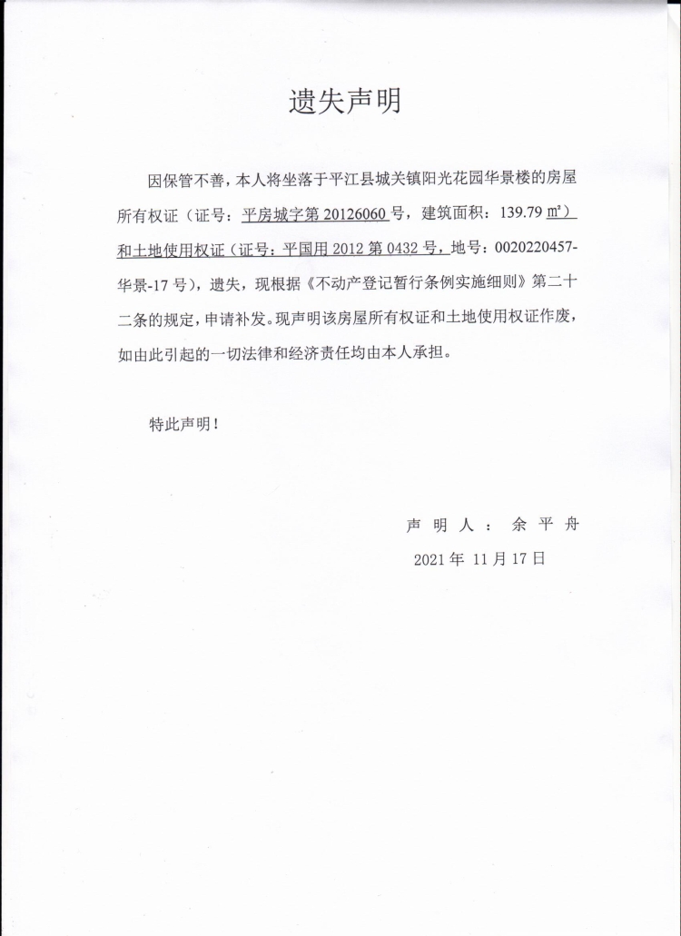 余平舟房屋所有权证和国土证遗失声明.jpg