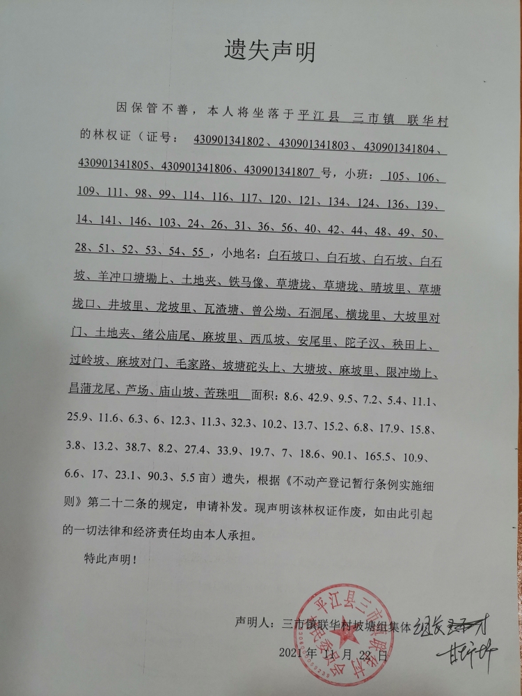 联华村坡塘组集体林权证遗失声明