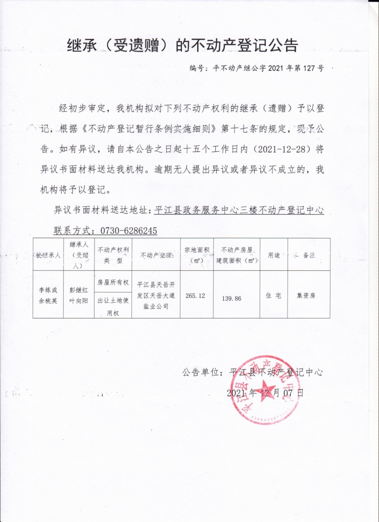 彭继红 叶向阳继承(受遗赠)的不动产登记公告2.jpg