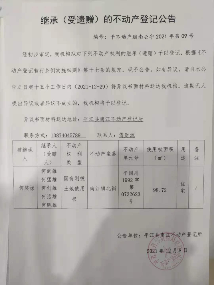 何奖禄继承(受遗赠)的不动产登记公告