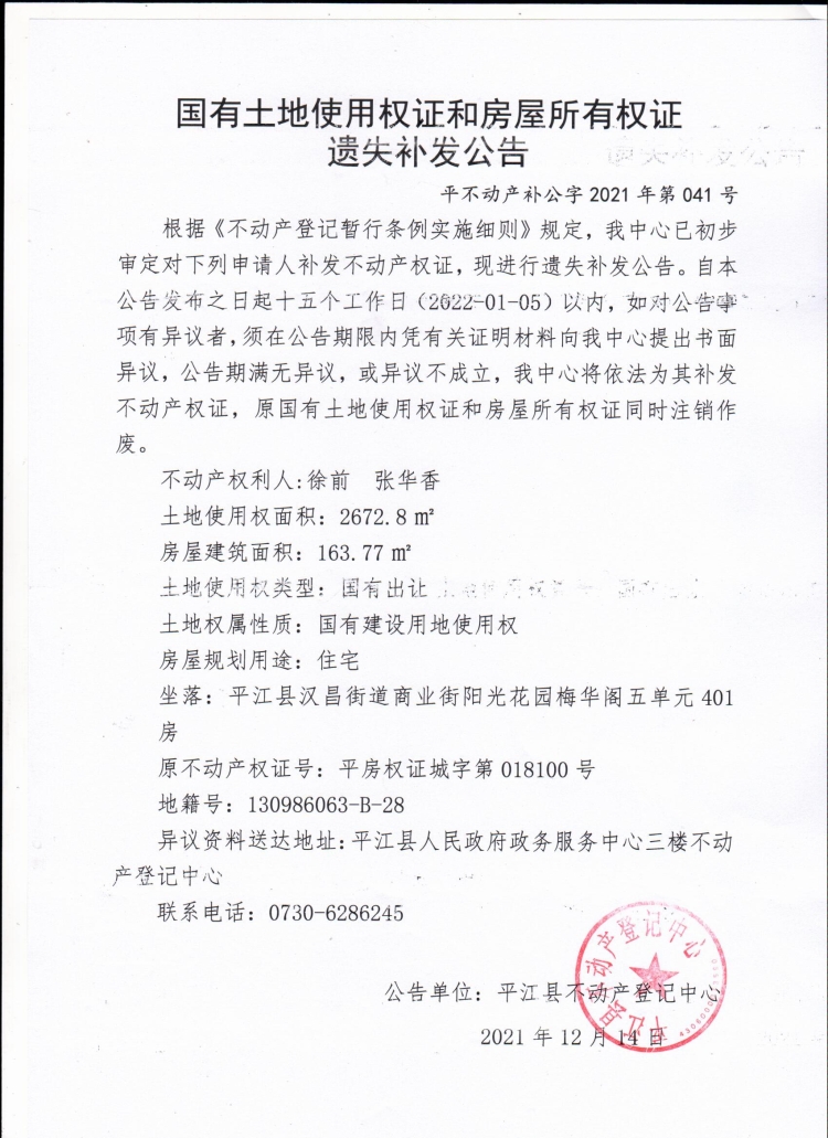 徐前、张华香国有土地使用权证和房屋所有权证遗失补发公告.jpg
