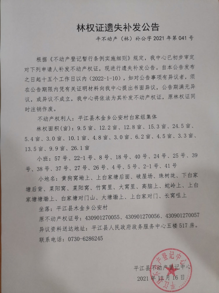 公安村白家组集体林权证遗失补发公告