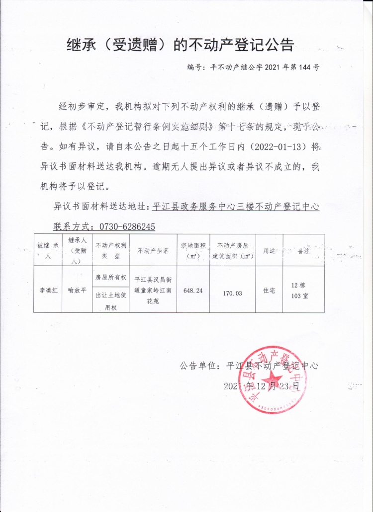 喻放平继承(受遗赠)的不动产登记公告.jpg
