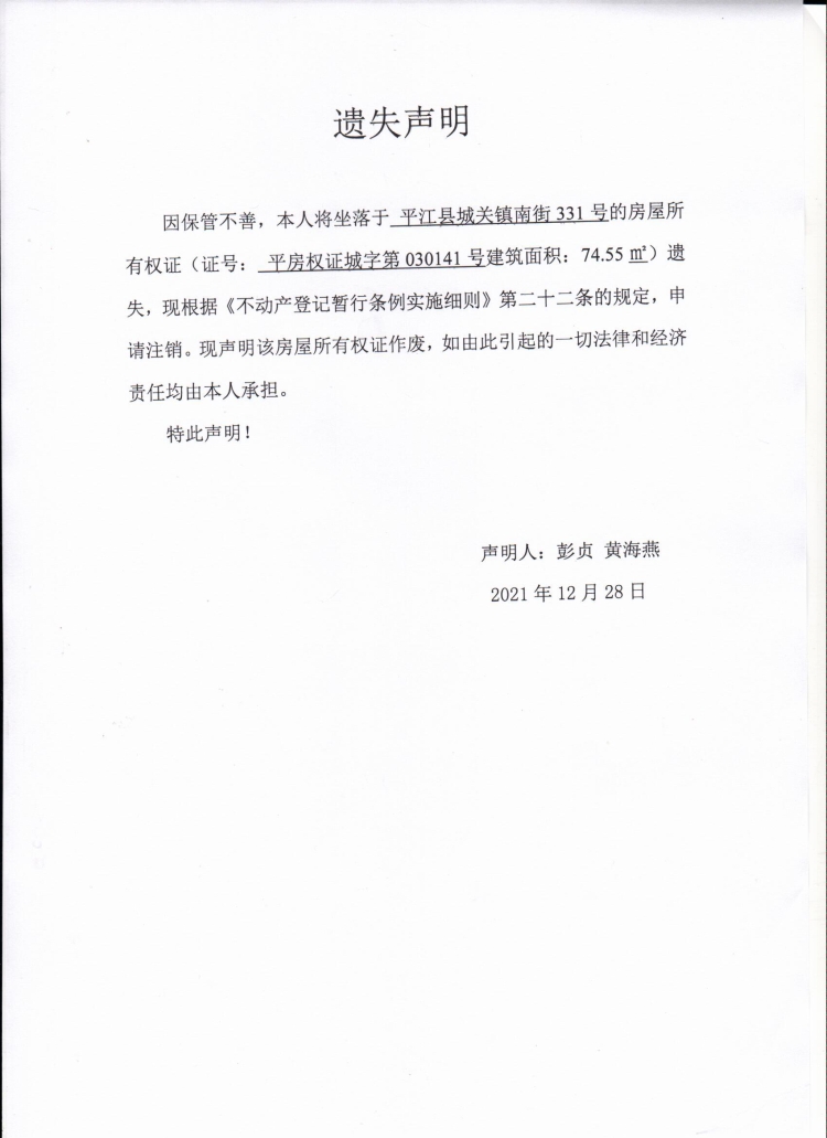 彭贞 黄海燕房屋所有权证遗失声明.jpg
