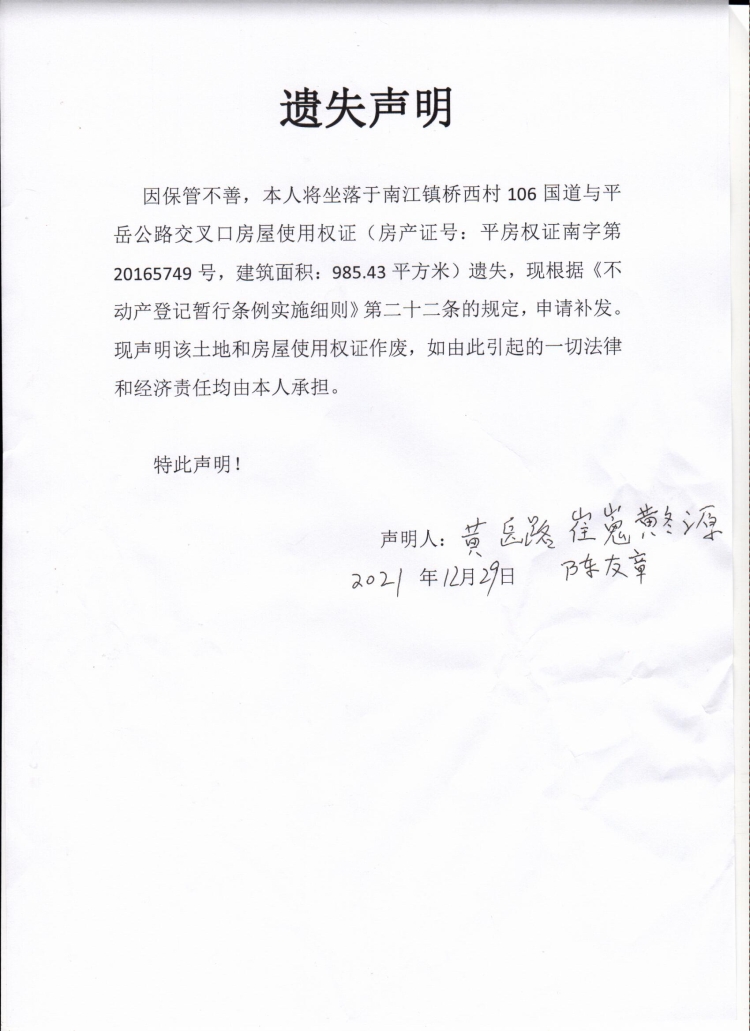 黄岳路 崔嵬 黄冬源 陈友章房屋使用权证遗失声明