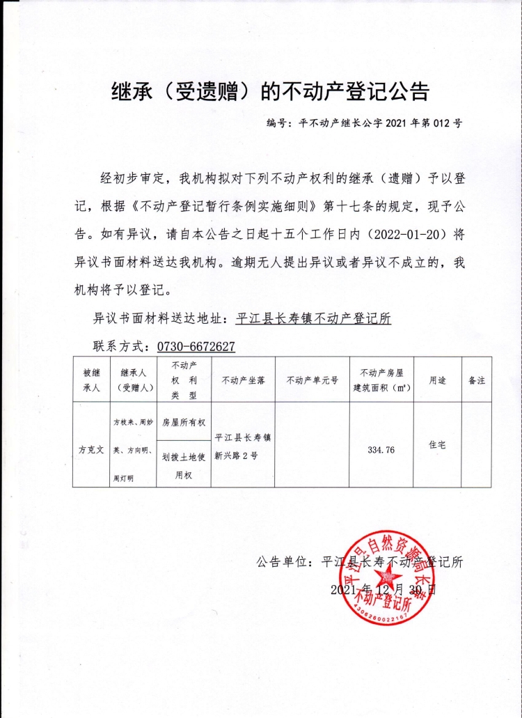 方枝来 周妙英 方向明 周灯明继承(受遗赠)的不动产登记公告
