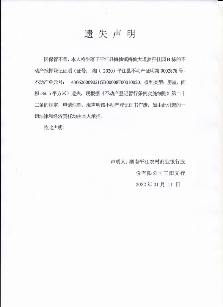 湖南省平江农村商业银行股份有限公司三阳支行不动产预告抵押证遗失声明.jpg