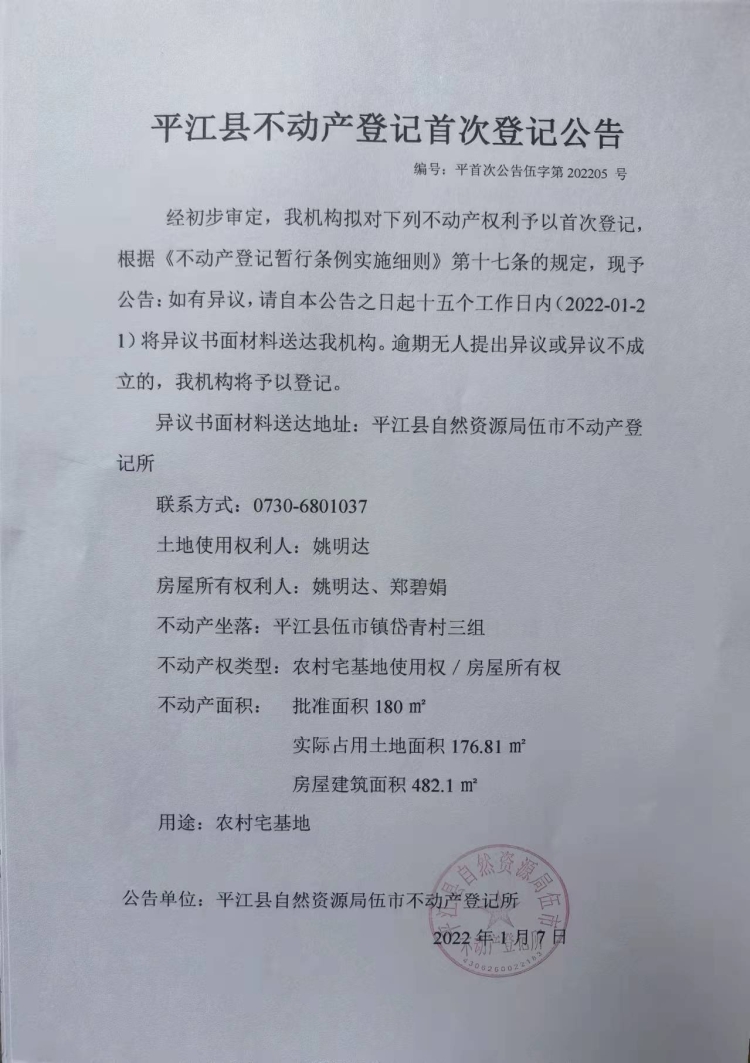 姚明达 郑碧娟 不动产登记首次登记公告