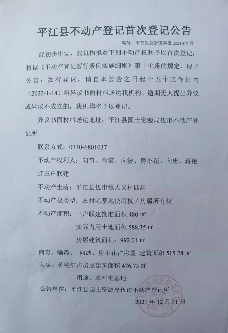 向奇 喻霞 向波 房小花 向忠 蒋艳虹 不动产登记首次登记公告