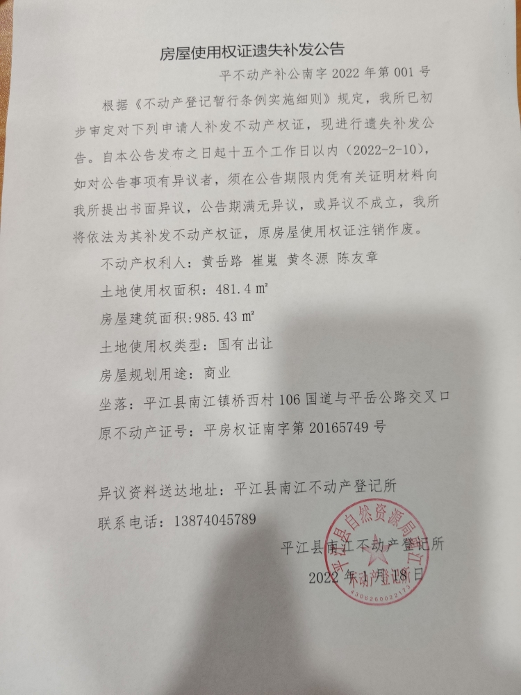 黄岳路 崔嵬 黄冬源 陈友章房屋使用权证遗失补发公告
