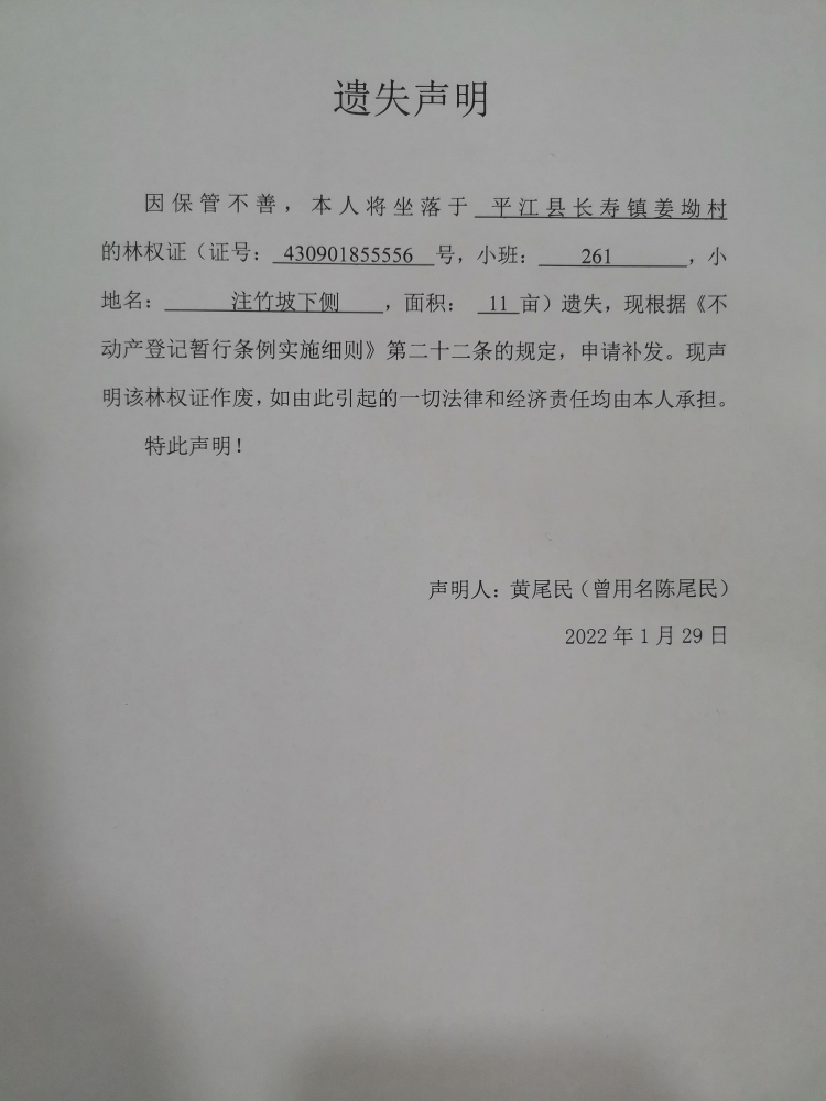 黄尾民林权证遗失声明