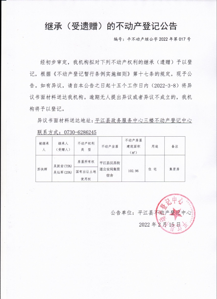 吴跃安,吴灿军继承(受遗赠)的不动产登记公告.jpg
