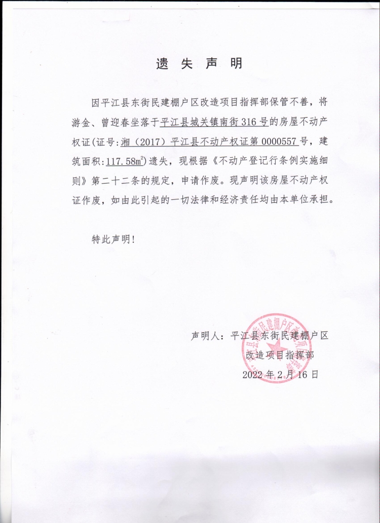 不动产权证遗失声明