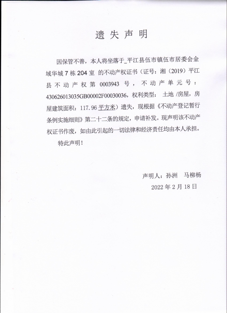 孙洲、马柳杨不动产权证遗失声明.jpg