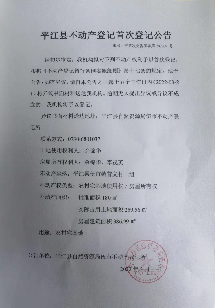余锦华 李祝英 平江县不动产登记首次登记公告