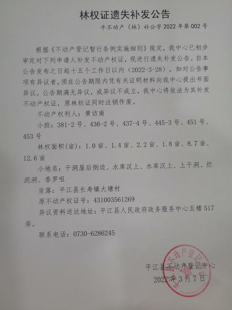 黄访南林权证遗失补发公告