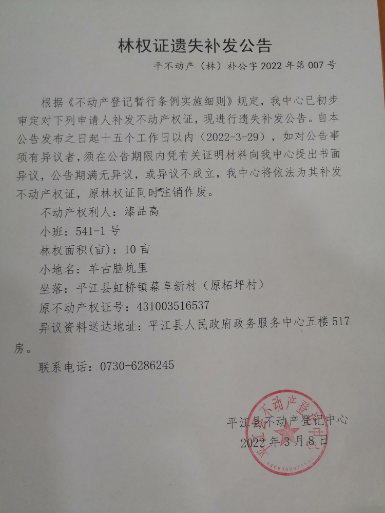漆品高林权证遗失补发公告