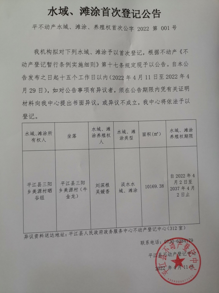 三阳乡美源村刘深根 吴媛香水塘水域、滩涂首次登记公告