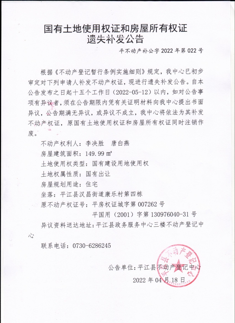 李决胜、唐白燕国有土地使用权证和房屋所有权证遗失补发公告.jpg
