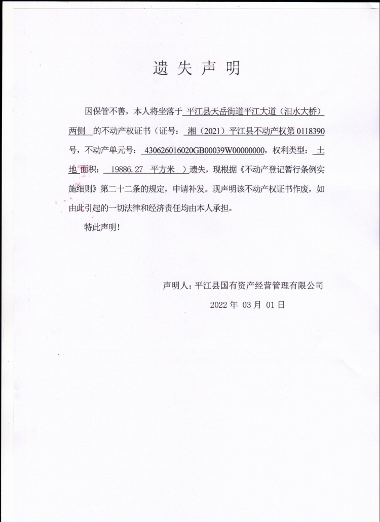 平江县国有资产经营管理有限公司国土证遗失声明,jpg