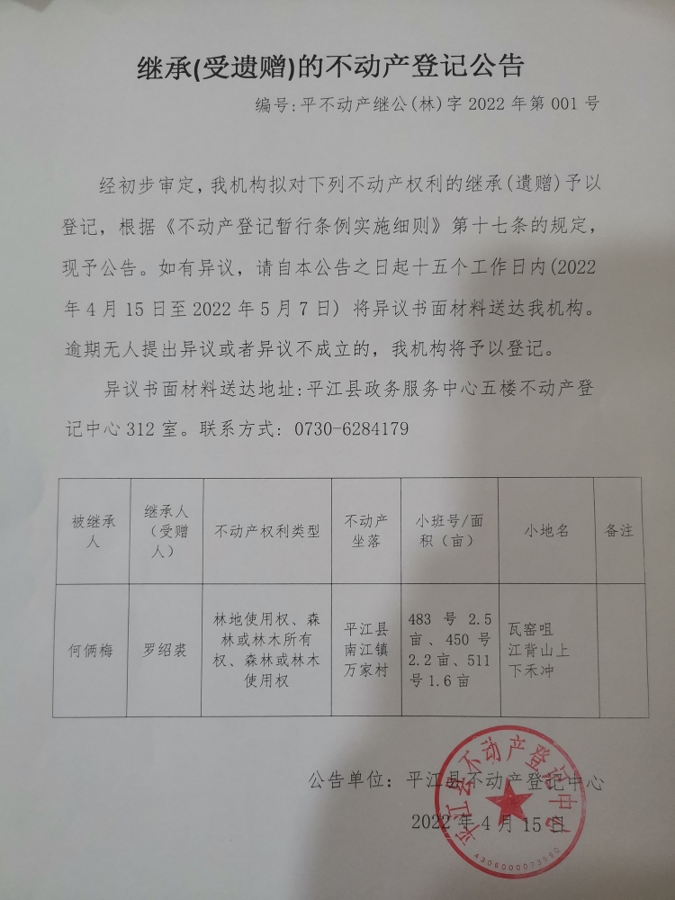 罗绍裘继承(受遗赠)的不动产登记公告