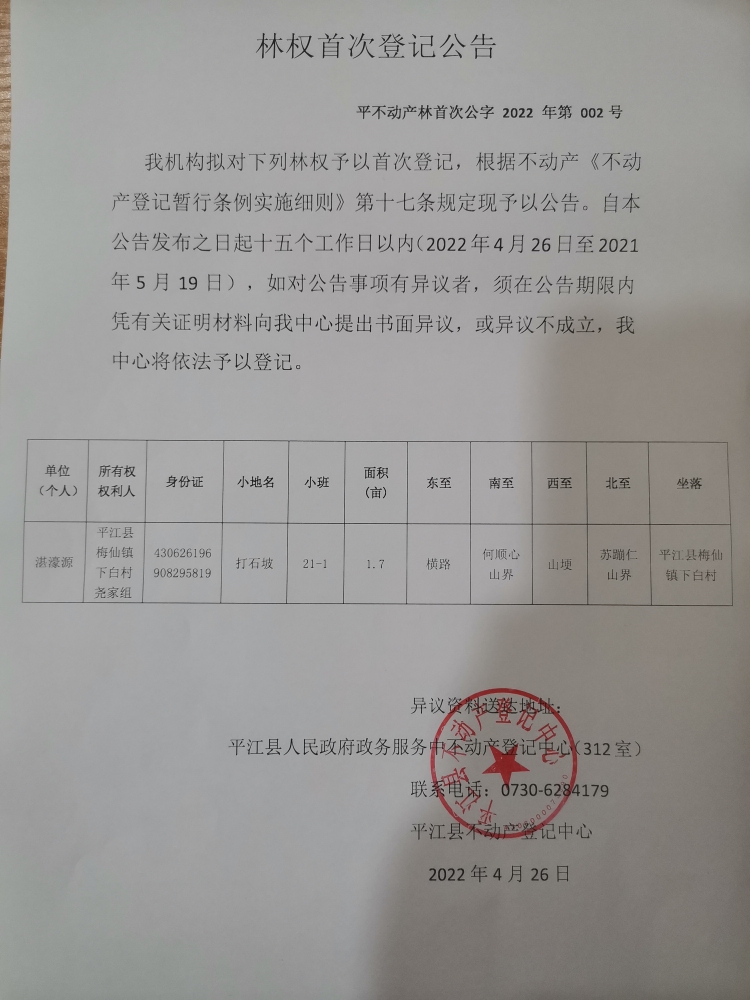 湛濠源林权首次登记公告