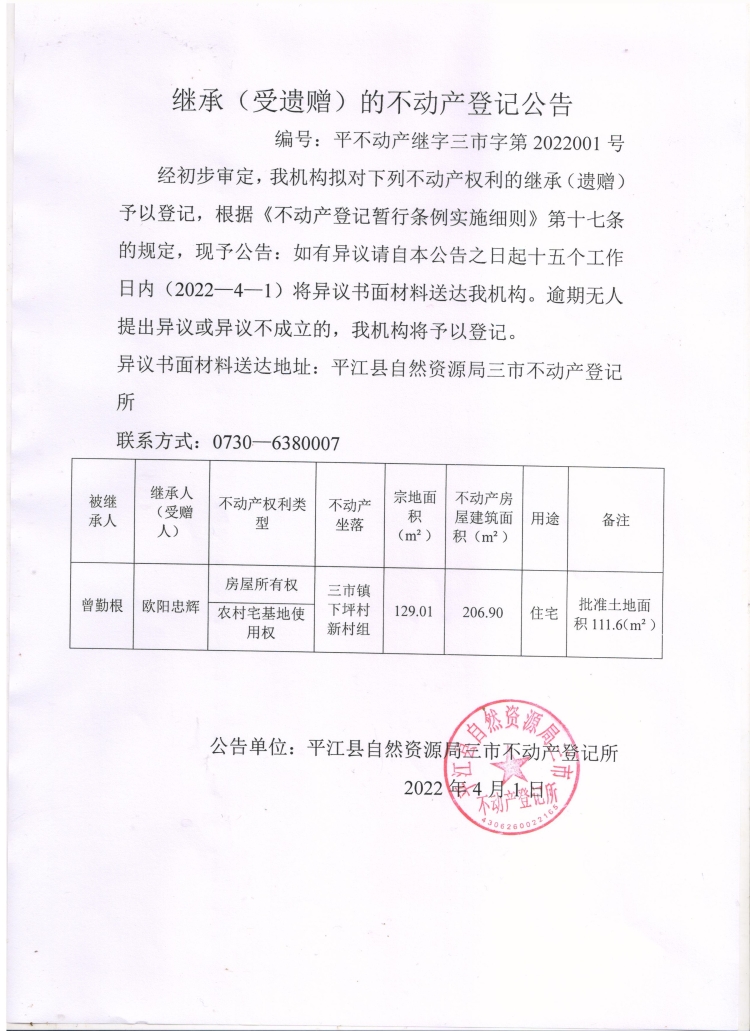 平江县三市镇欧阳忠辉继承不动产登记公告