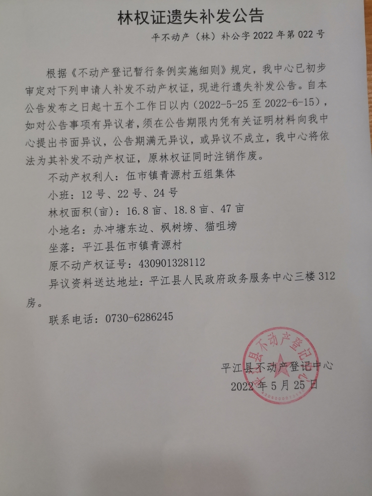 伍市镇青源村五组集体林权证遗失补发公告