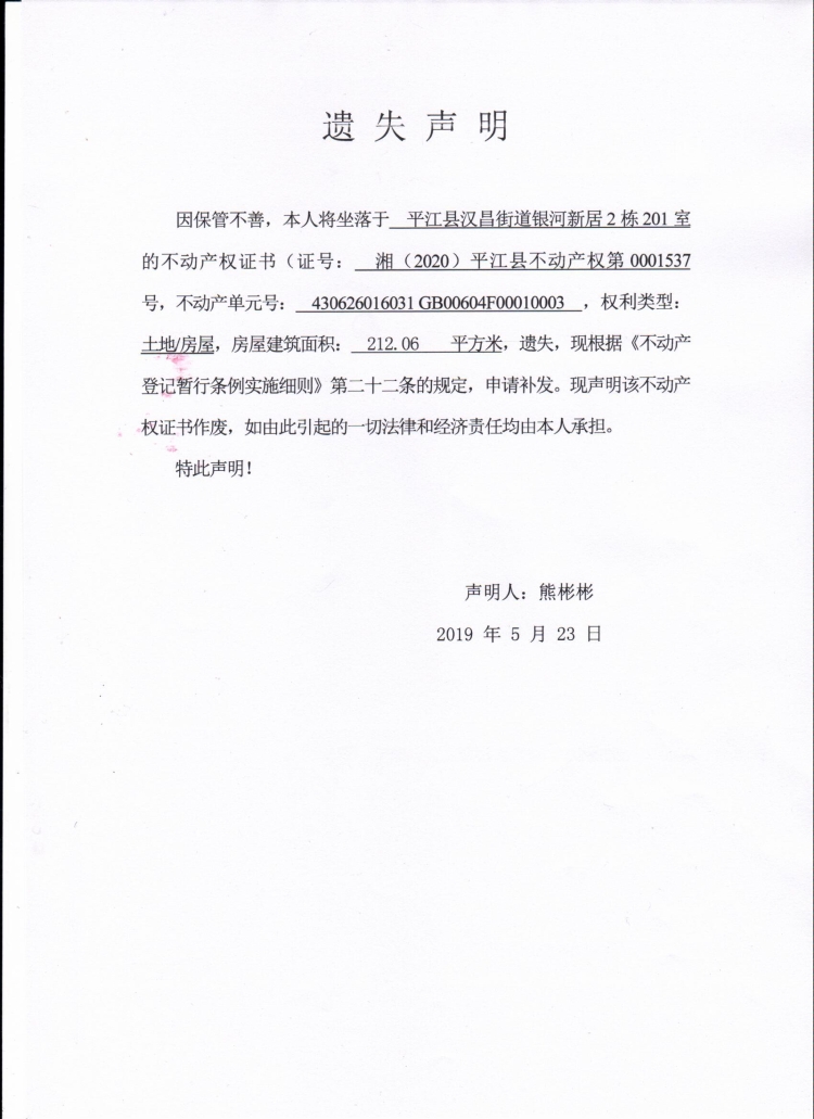 熊彬彬不动产权证遗失声明