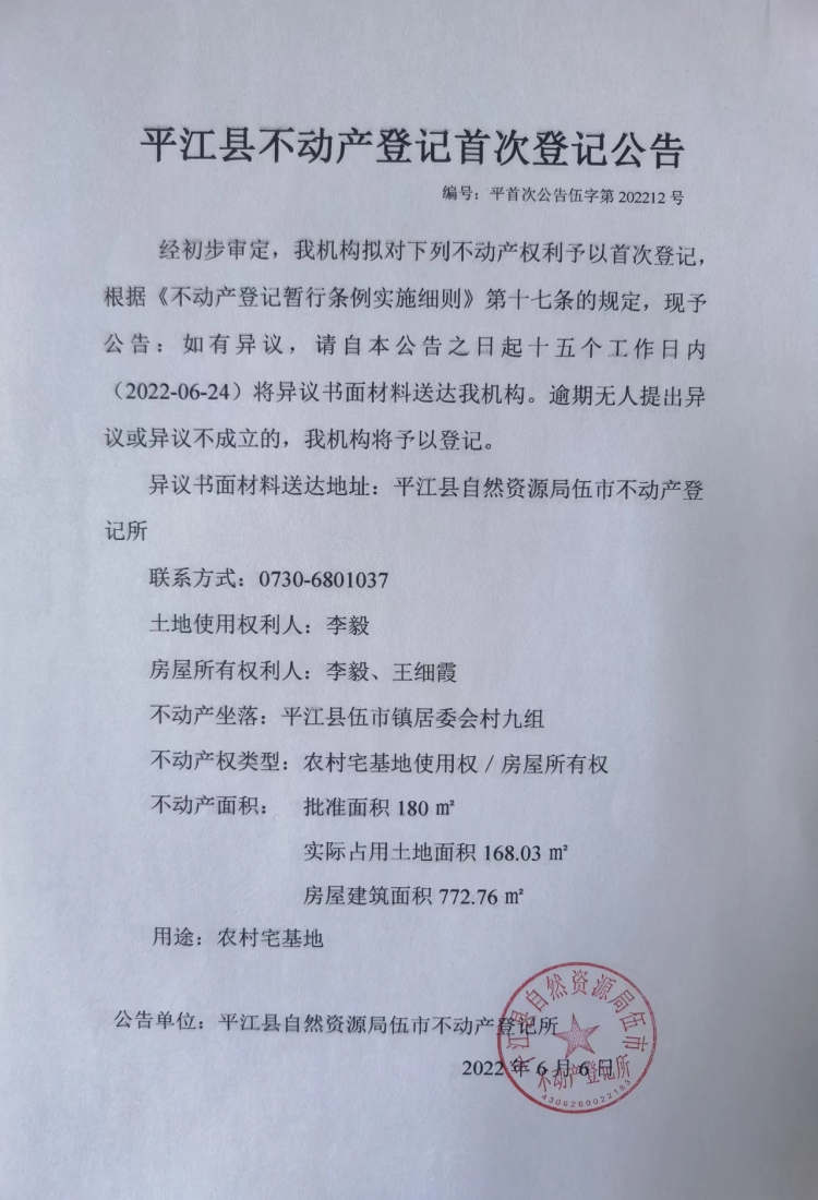 李毅 王细霞 不动产登记首次登记公告