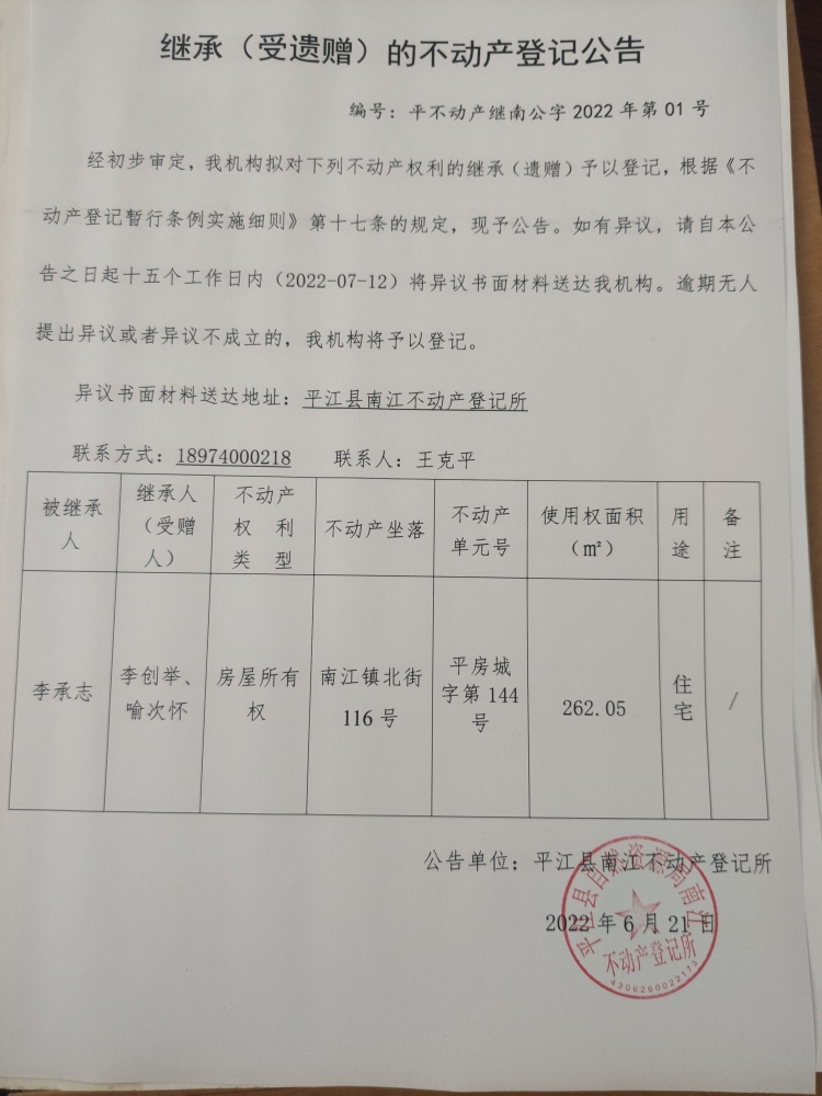 李承志继承(受遗赠)的不动产登记公告