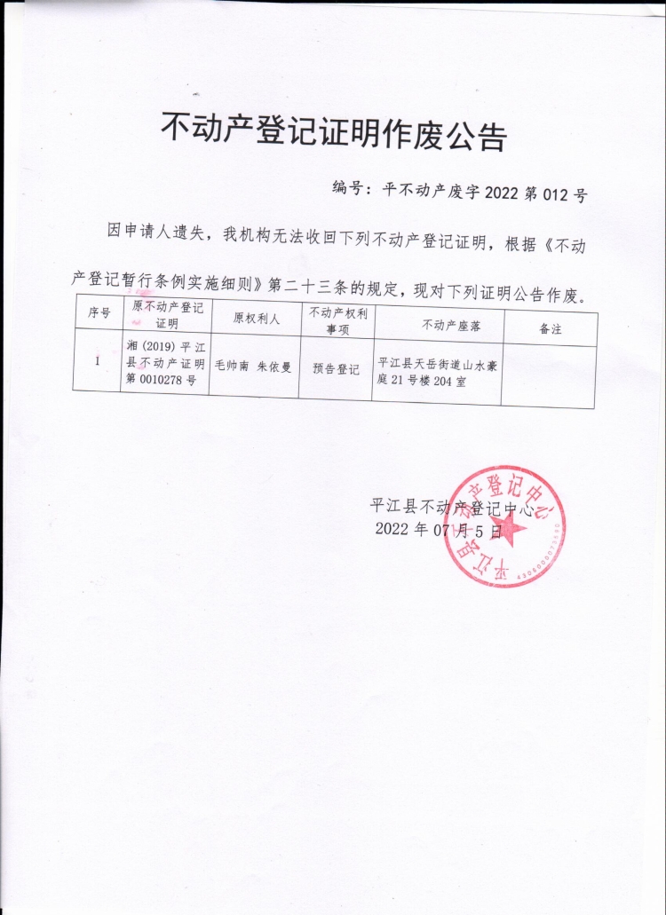 毛帅南、朱依曼不动产证明作废公告.jpg