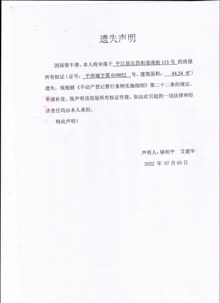 骆初平、艾建华房屋所有权证遗失声明.jpg