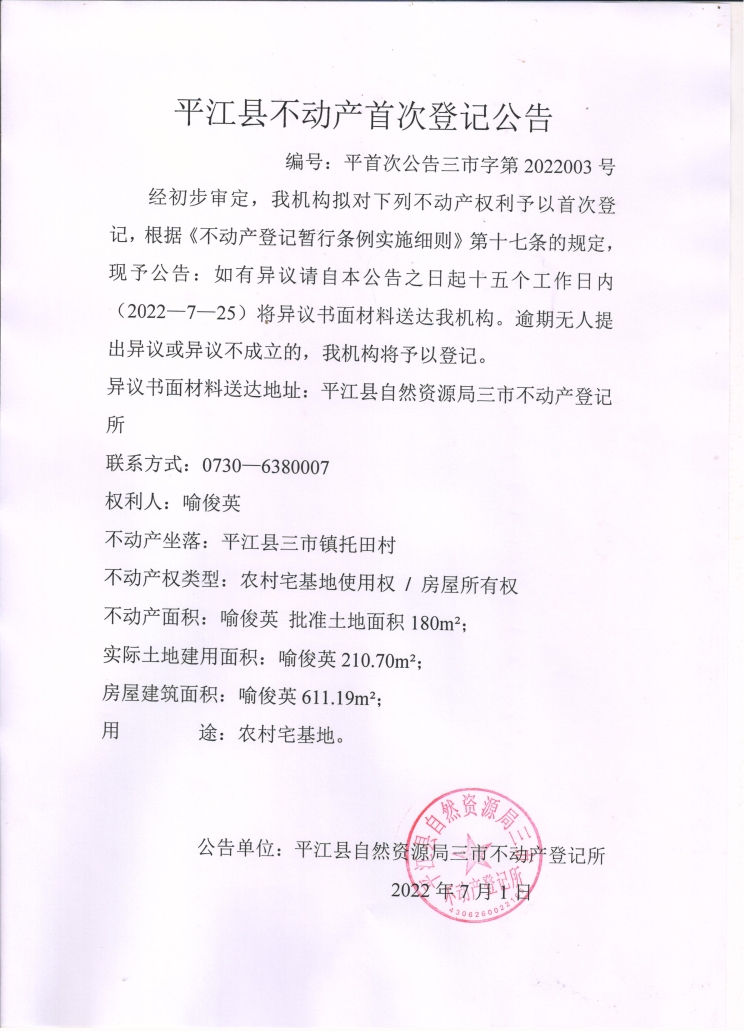 喻俊英不动产首次登记公告