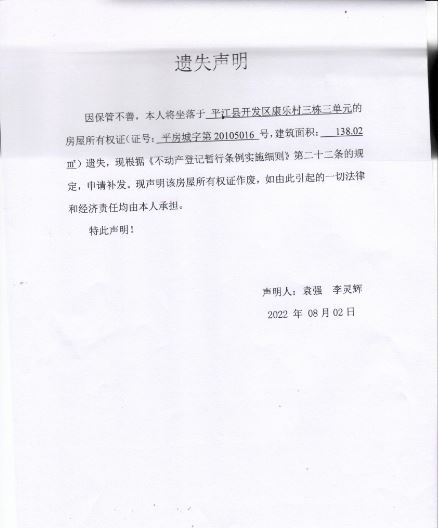 袁强、李灵辉房产证遗失声明