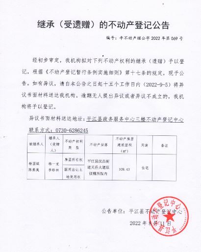 杨一龙、李珍林继承(受遗赠)的不动产登记公告